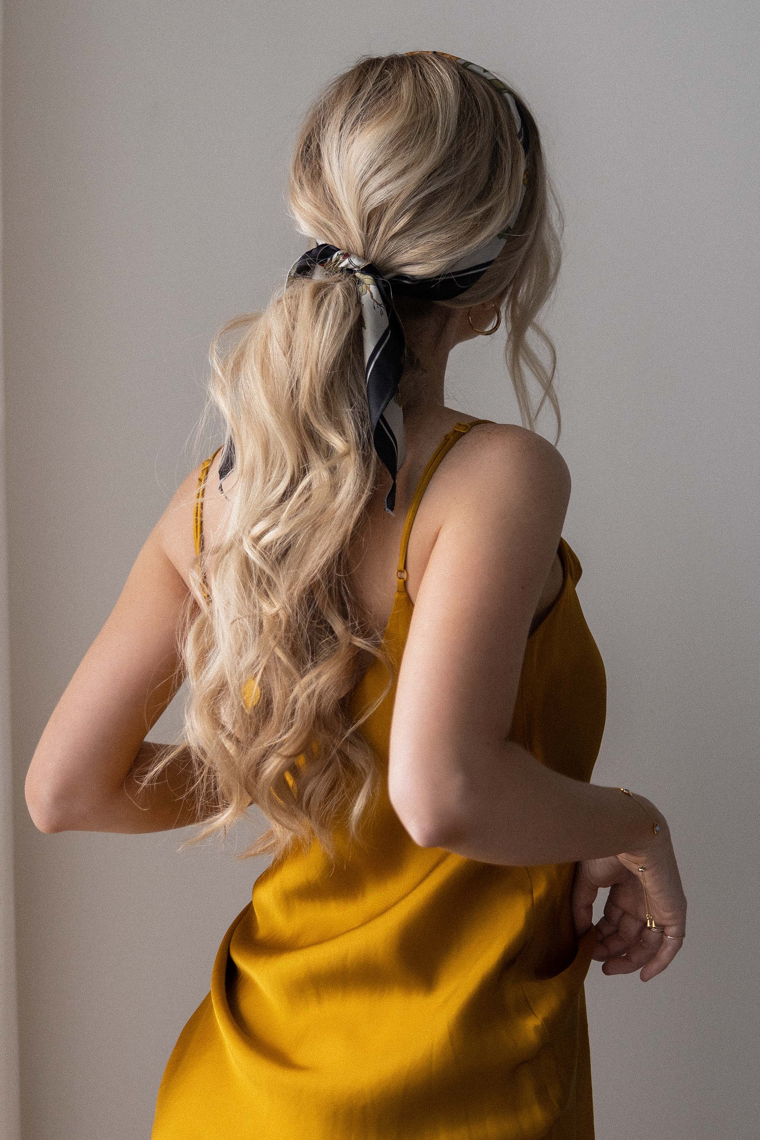 Today’s how to hair tutorial is new + easy scarf hairstyles for spring + summer 2021! These hairstyles are great for medium – long hair hair lengths, and would make perfect wedding, prom, and bridal hairstyles. First is a simple down look using the scarf as a headband, this is such a cute and easy way to switch up your everyday hair. The second look is a scarf ponytail hairstyle, I love how the scarf instantly dresses up this look making it the perfect summer look. Third is a braided hairstyle, I wasn’t planning on sharing this one, but I am so glad I did because it ended up being my favourite. Forth is a gorgeous low bun, this updo would be perfect for any special occasion, and is such a beautiful way to keep your hair up off your neck during the warmer months. Lastly, a voluminous braided scarf ponytail. I shared this tutorial in my last video, and I thought it would look so beautiful with an added scarf detail. I love how this turned out and I can’t wait to see your recreations!Â