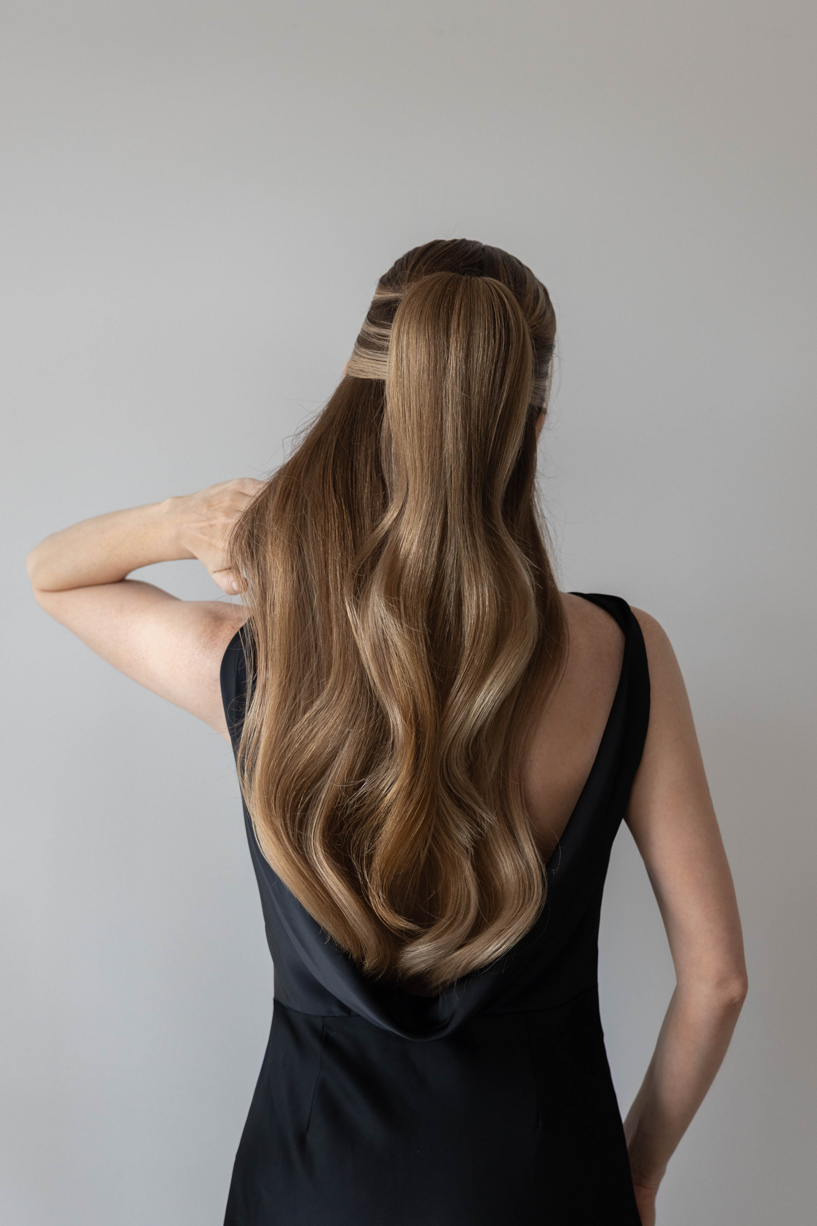 I’m wearing my Luxy Hair Seamless Clip-Ins in Bronde Balayage, which add the perfect fullness and always create a beautiful base for styling.