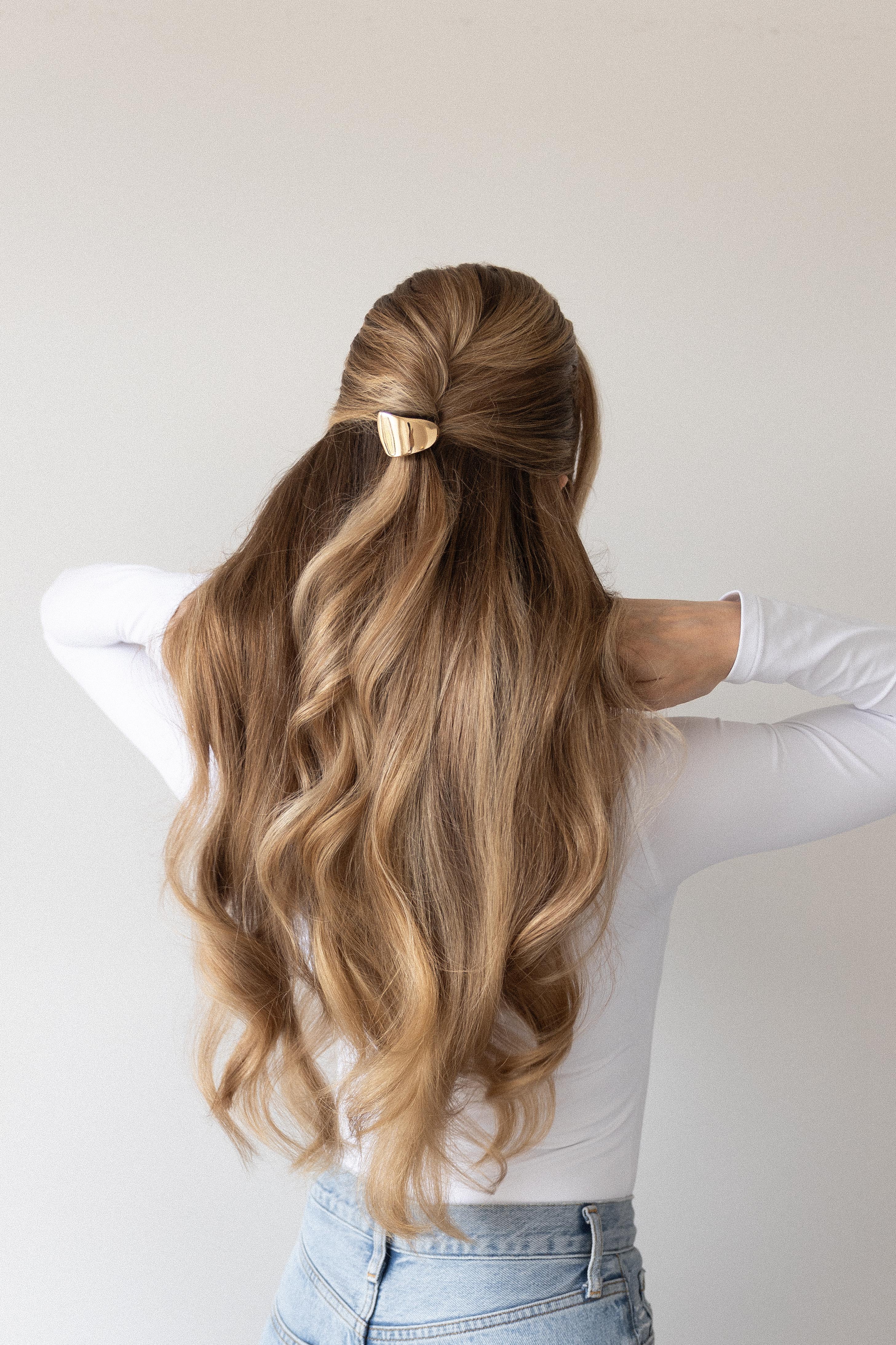 If your hair is shorter or thinner, add 2–3 wefts at the crown for fullness. I’m using Luxy Hair‘s Bronde Balayage Seamless Extensions 20” (coupon code AGABOURY to save $).